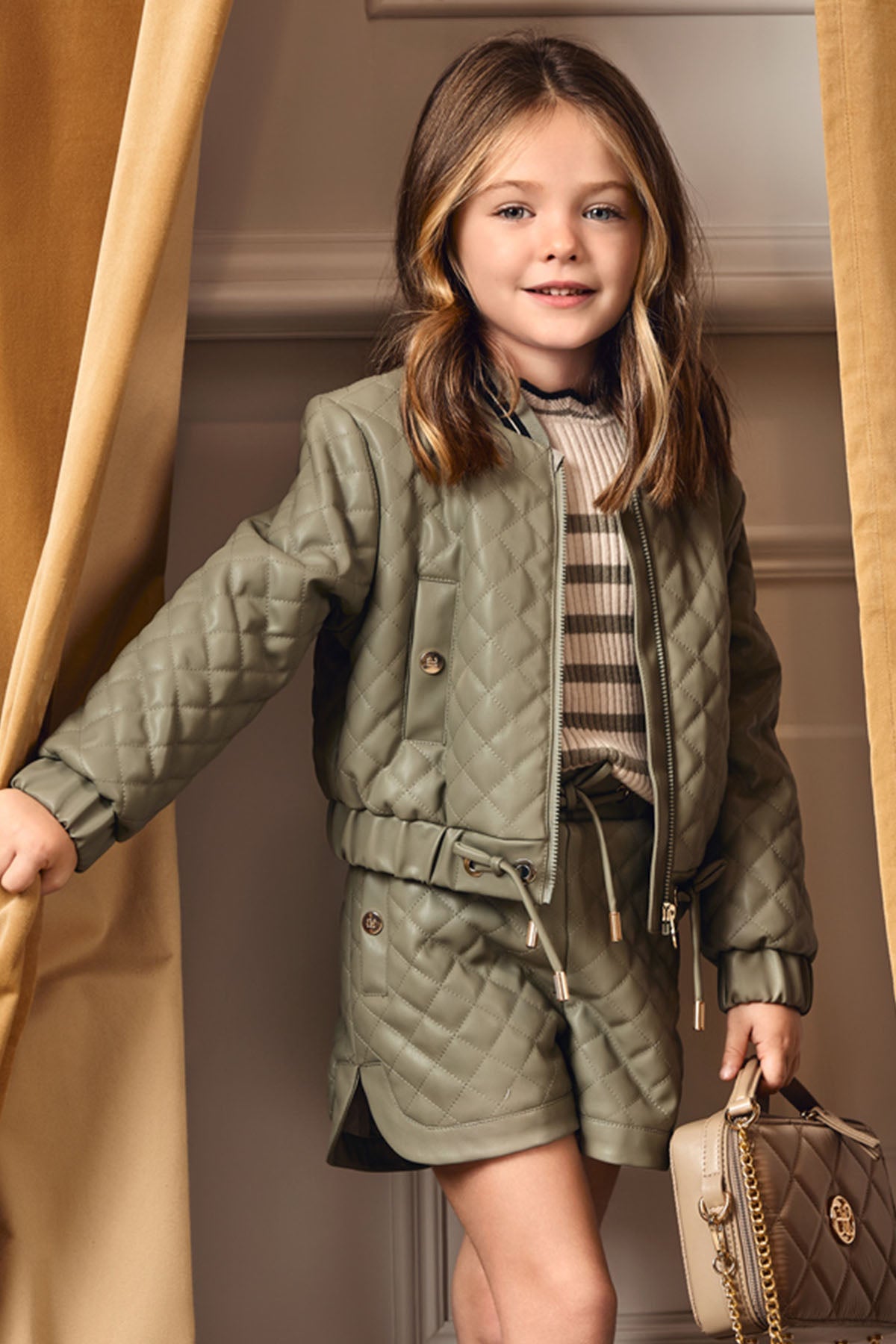 Deze groene leren short met subtiel ruitjesdetail is een echte statement piece. Het stoere design wordt extra kracht bijgezet door de structured fit en luxe uitstraling. Perfect te combineren met de bijpassende bomberjack voor een complete, edgy look. Ideaal voor modieuze meisjes met lef.